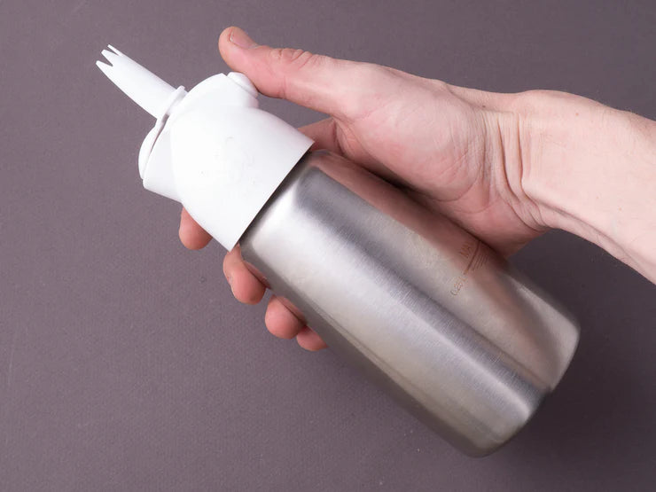 Sifón de crema compacto y fácil de usar, ideal para preparar cremas batidas, espumas, salsas y toppings con textura ligera y consistente. Su diseño en acero inoxidable lo hace resistente y perfecto tanto para uso en casa como en entornos profesionales de cocina o barra.