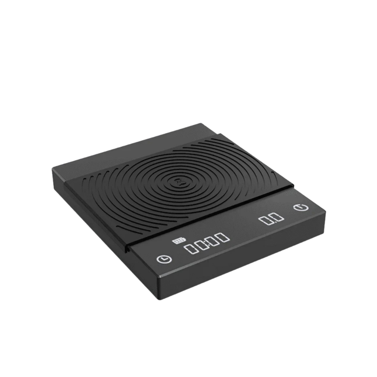 Balanza de café multifunción TIMEMORE con sensores de alta precisión (desde 0.5 g hasta 2 kg), ideal para café, cocina y repostería. Fabricada en acrílico compacto y duradero, con superficie y puerto de carga resistentes al agua. Incluye temporizador, prueba de caudal, pantalla LCD retroiluminada, función de tara y batería recargable de 1600 mAh con carga USB y hasta 10 h de uso.